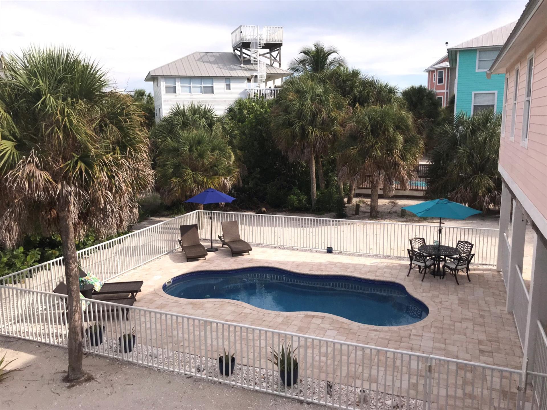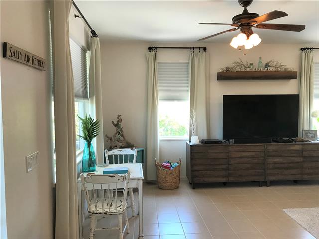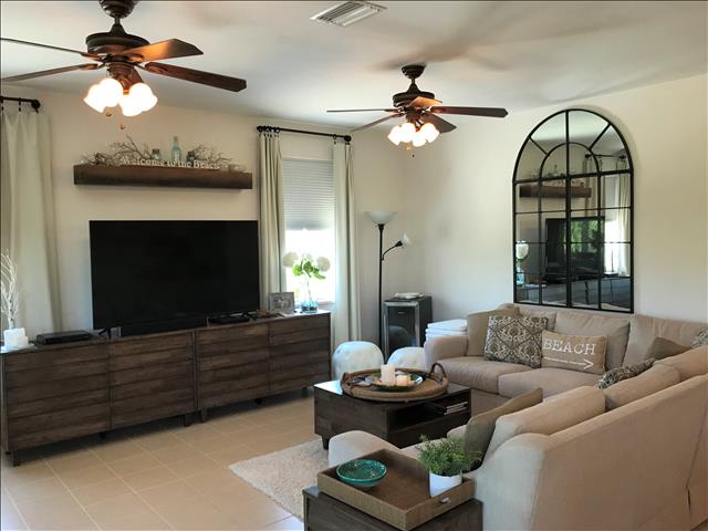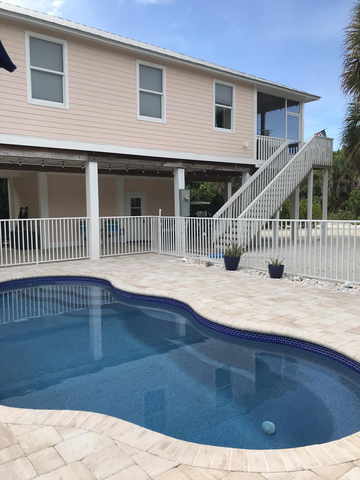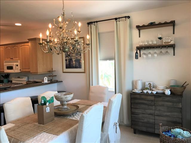 Our Home Features: an Oversized, Lagoon Style, Private, Heated, Salt Water Pool with Lots of Seating, with a Large Under Cover Lighted Entertaining Area and a Great Cleared Yard for all of your Outdoor Activities! Plus a Huge Screened Lighted Porch for Dining and Entertaining with Tropical Lush Views! Our Beautiful Pool Home with its 2 Bedrooms, Open - Tiled - One Level Floor Plan, Large Flat Screen TVS throughout, and Excellent Beds will Entice You, PLUS Our Homes' Interior and Exterior Furnishings are all either Brand New or Very Recently Purchased New Throughout including New Furniture, New Mattresses, New Linens, New Towels, and New Allergen Coverings. Our Focus is Clean, Luxury, and Comfortable Furnishings. Our Home is Fully Stocked Kitchen with High End Appliances. New Stainless Steel French Door Refrigerator 3/2020. Gas Cooking and Convection baking and microwave. New Full Size Washer and Dryer 2/2020. New 65" Samsung Crystal UHD Smart TV 11/2021. Includes: Bakeware, Cookware, Barware, Entertaining Specialty Dishes, and More! We offer a Fantastic Vacation Rental Value, Your Own Personal Golf Cart Included, High Speed Internet, Low Fees, and it is Amenity Packed! Including such Extras as Stocked Cleaning, Laundry, Dishes, and Toiletry Essentials, Spices, Cooking Sprays, Full Coffee and Tea Bar, Propane for Your Gas Grill, Printer with Ink and Paper, and is Fully Equipped for Travelers with Babies and/or Children. Guest Appreciation Welcome Perks include a Welcome Bottle of White Wine and a Bottle of Sparkling Mineral Water.