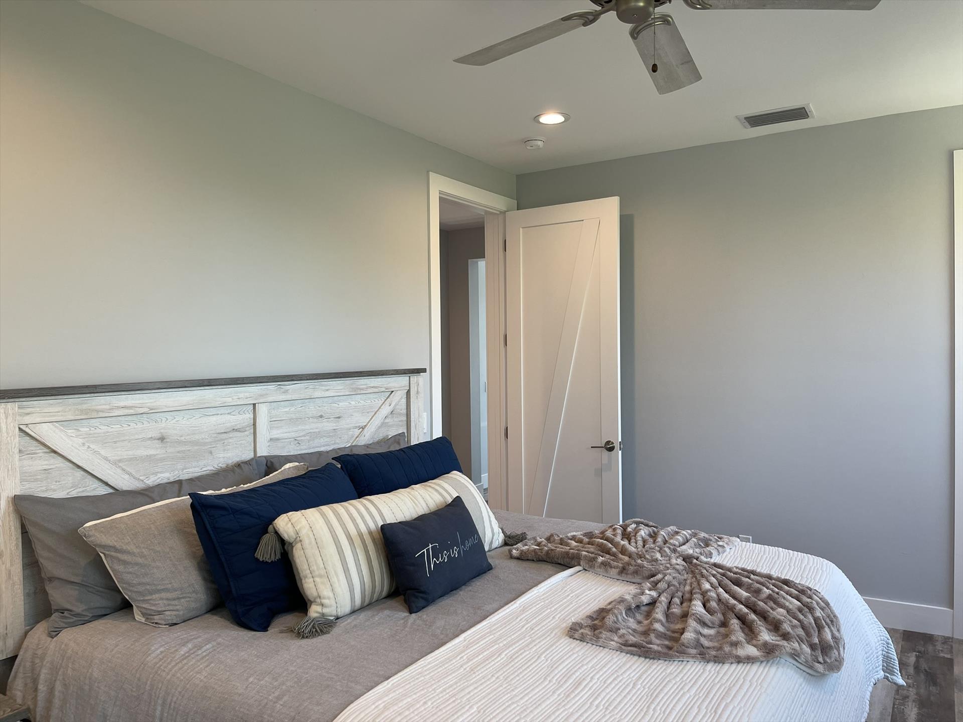 1st Floor - Guest Bedroom Right Side - Queen Size Bed, Bureau, Closet, Nightstand, and Fan.