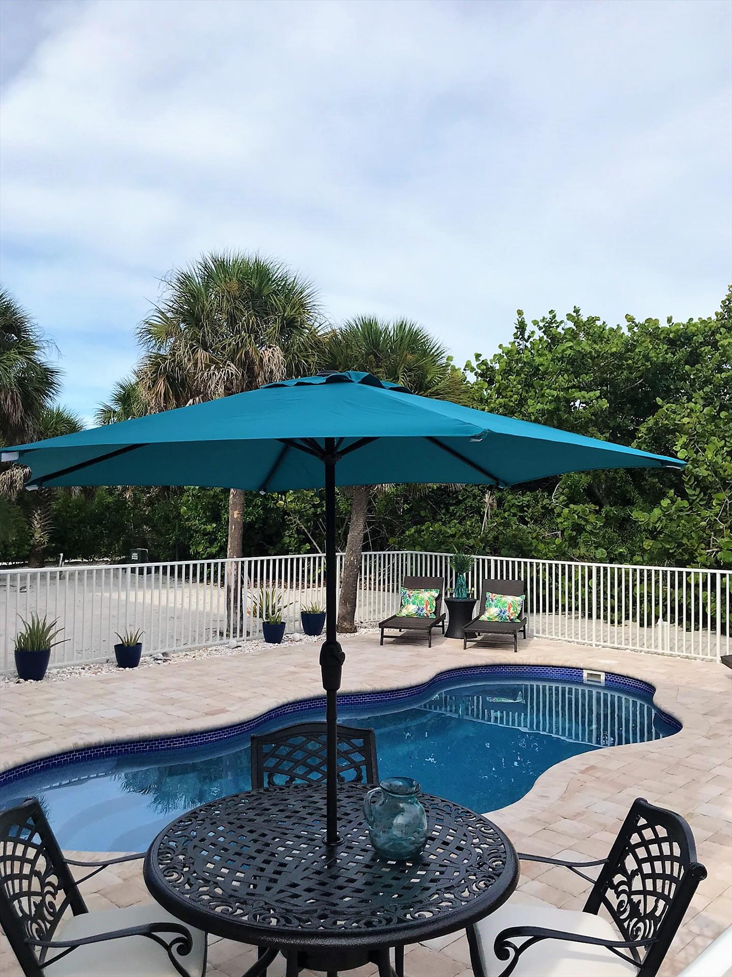 Our Home Features: an Oversized, Lagoon Style, Private, Heated, Salt Water Pool with Lots of Seating, with a Large Under Cover Lighted Entertaining Area and a Great Cleared Yard for all of your Outdoor Activities! Plus a Huge Screened Lighted Porch for Dining and Entertaining with Tropical Lush Views! Our Beautiful Pool Home with its 2 Bedrooms, Open - Tiled - One Level Floor Plan, Large Flat Screen TVS throughout, and Excellent Beds will Entice You, PLUS Our Homes' Interior and Exterior Furnishings are all either Brand New or Very Recently Purchased New Throughout including New Furniture, New Mattresses, New Linens, New Towels, and New Allergen Coverings. Our Focus is Clean, Luxury, and Comfortable Furnishings. Our Home is Fully Stocked Kitchen with High End Appliances. New Stainless Steel French Door Refrigerator 3/2020. Gas Cooking and Convection baking and microwave. New Full Size Washer and Dryer 2/2020. New 65" Samsung Crystal UHD Smart TV 11/2021. Includes: Bakeware, Cookware, Barware, Entertaining Specialty Dishes, and More! We offer a Fantastic Vacation Rental Value, Your Own Personal Golf Cart Included, High Speed Internet, Low Fees, and it is Amenity Packed! Including such Extras as Stocked Cleaning, Laundry, Dishes, and Toiletry Essentials, Spices, Cooking Sprays, Full Coffee and Tea Bar, Propane for Your Gas Grill, Printer with Ink and Paper, and is Fully Equipped for Travelers with Babies and/or Children. Guest Appreciation Welcome Perks include a Welcome Bottle of White Wine and a Bottle of Sparkling Mineral Water.