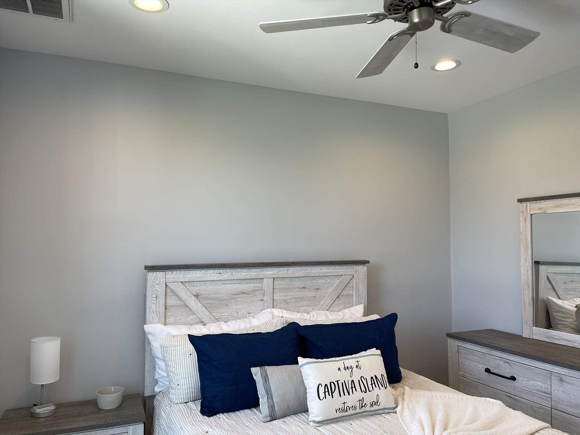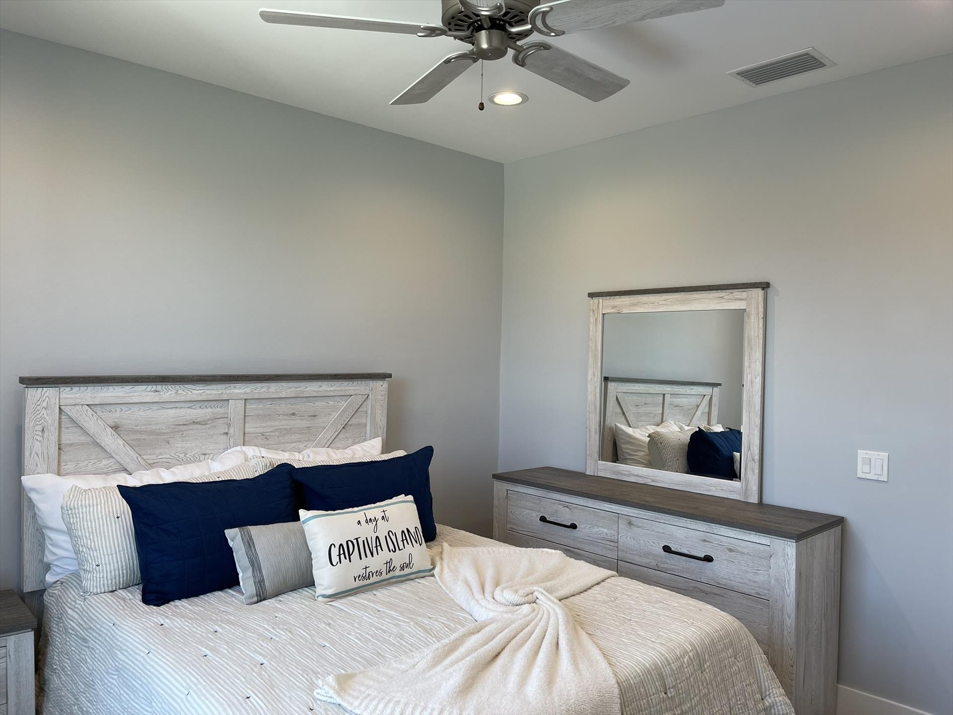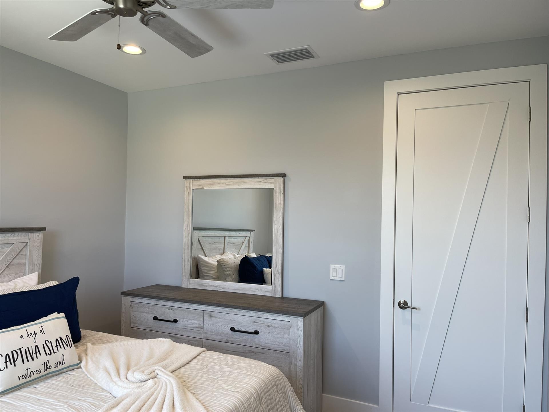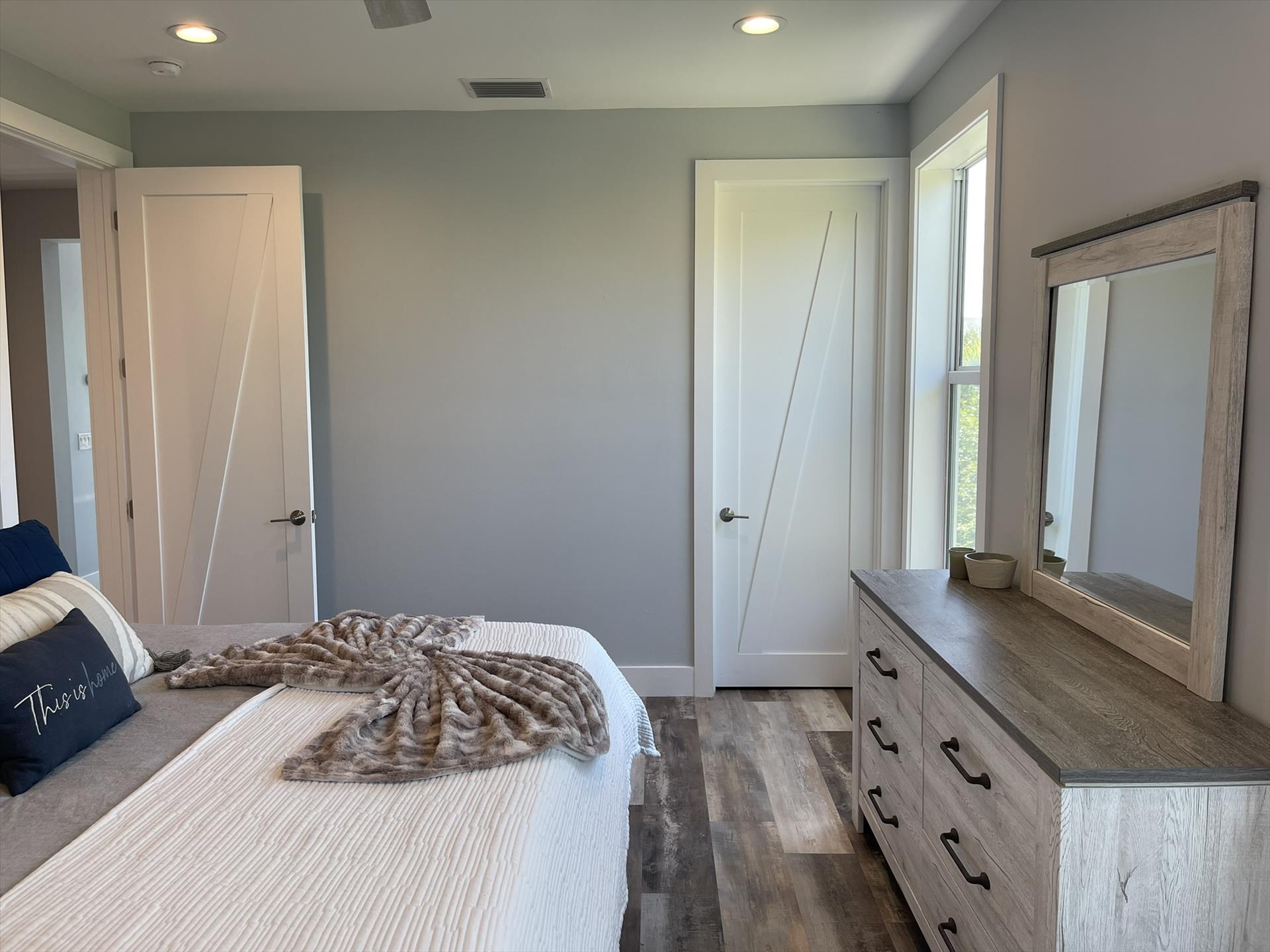 1st Floor - Guest Bedroom Right Side - Queen Size Bed, Bureau, Closet, Nightstand, and Fan.