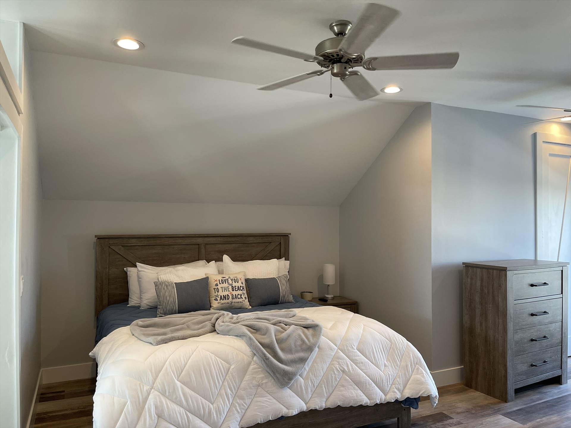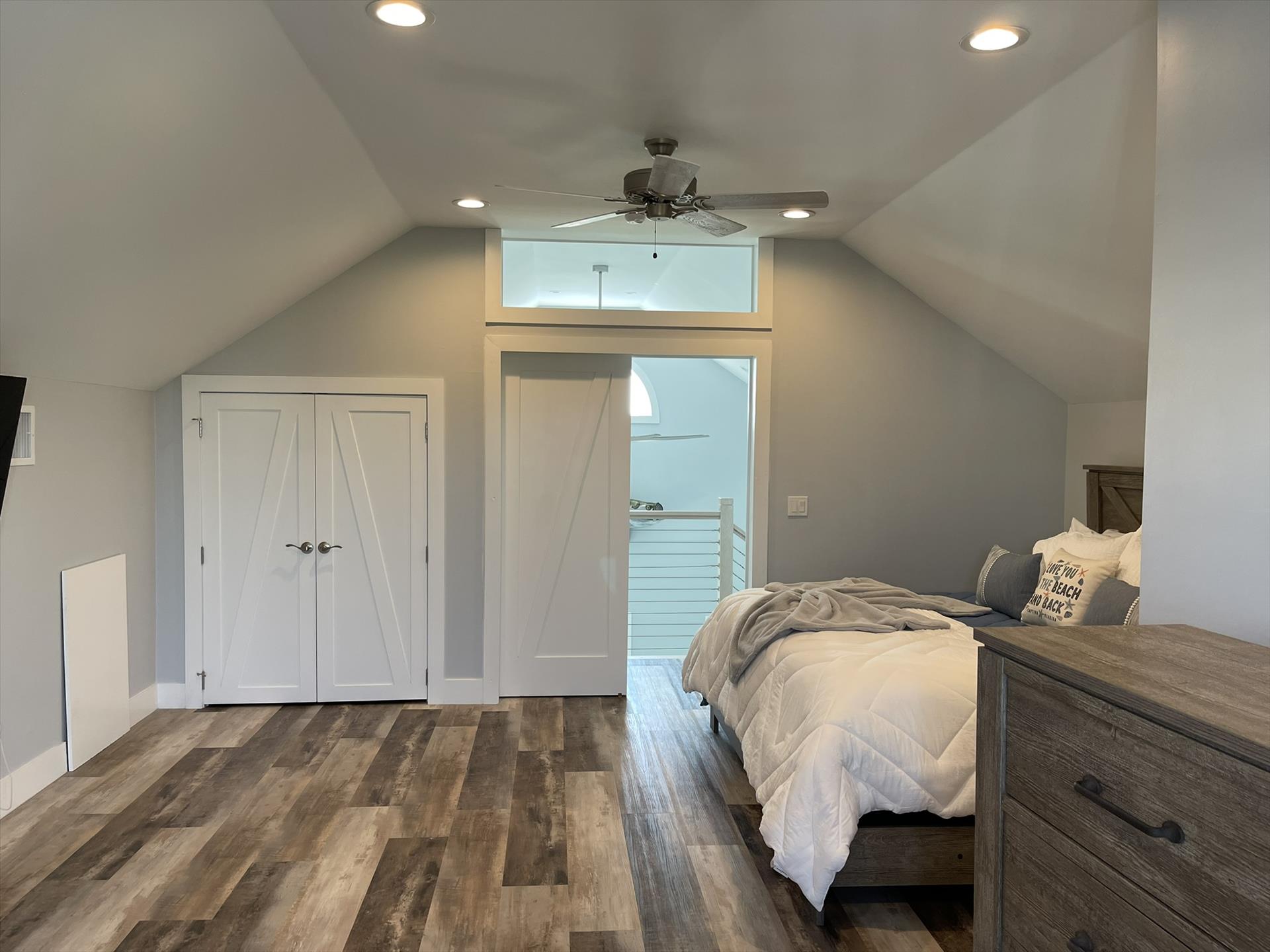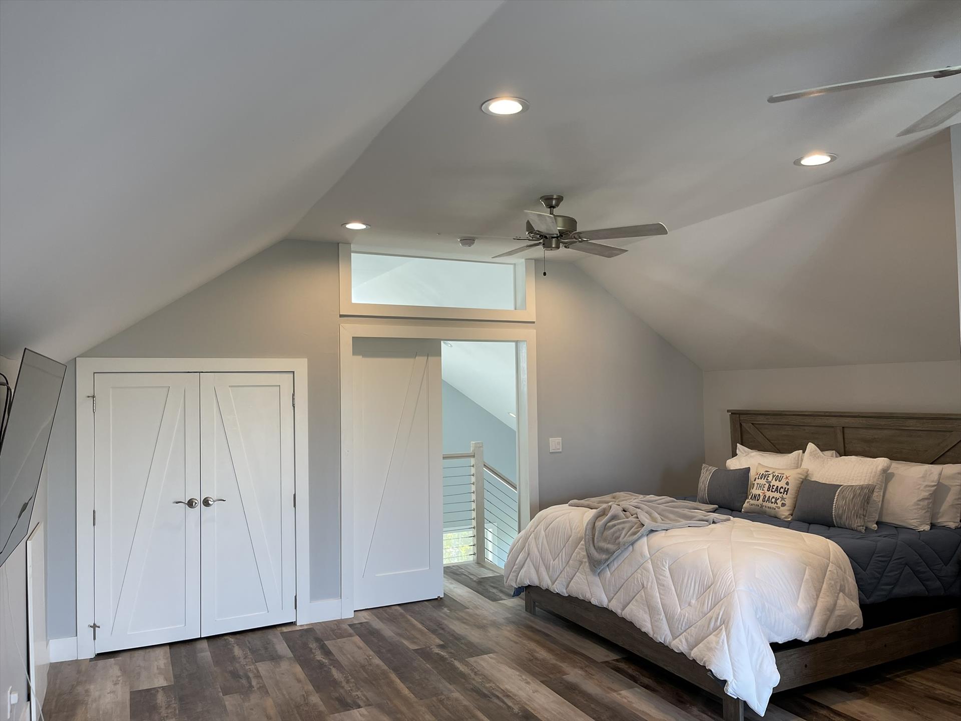 2nd Floor Loft - Huge Main Bedroom with King Bed, Nightstand, TV, Fan, Bureau and Closet. Walk out Back Yard Balcony. En Suite Full Bath with Sink, Toilet, and Tiled Shower.