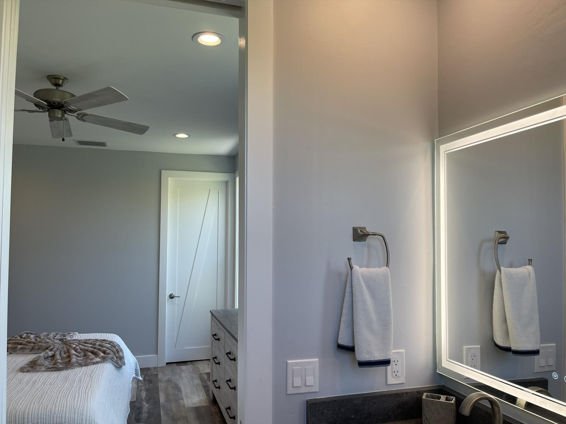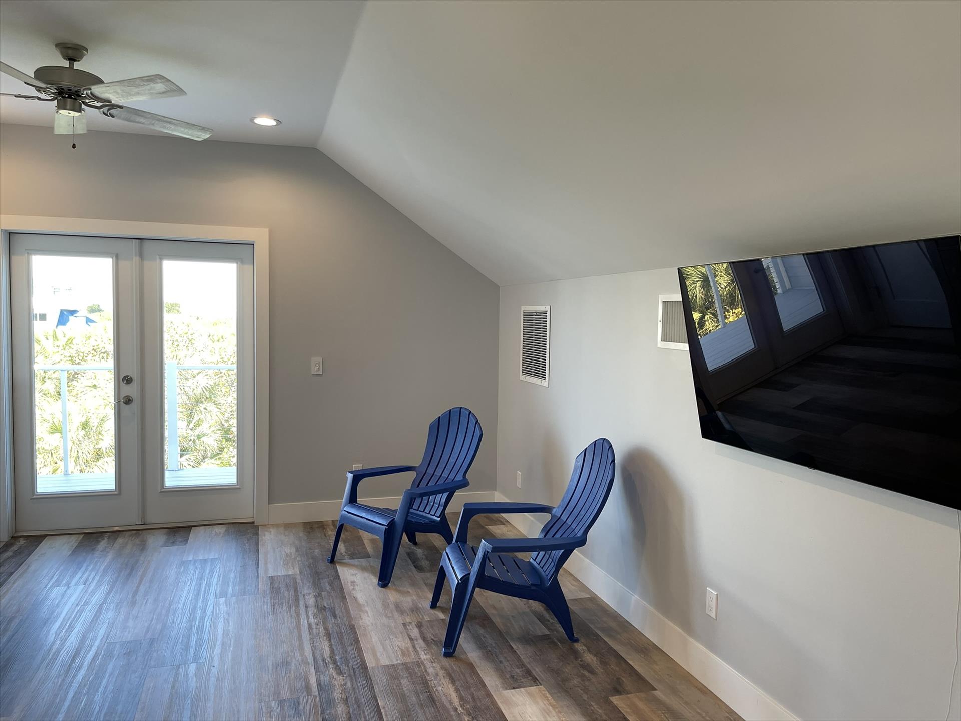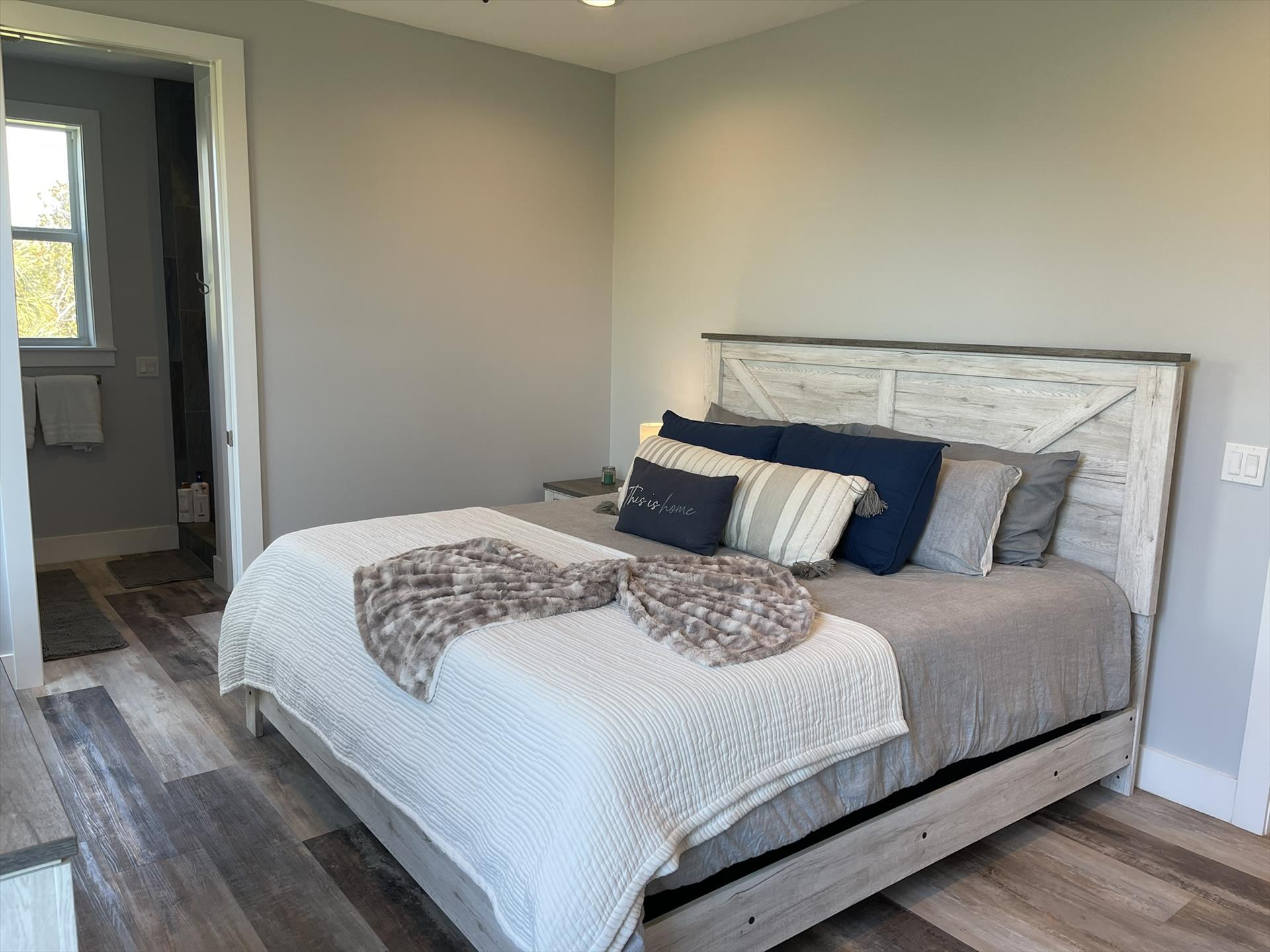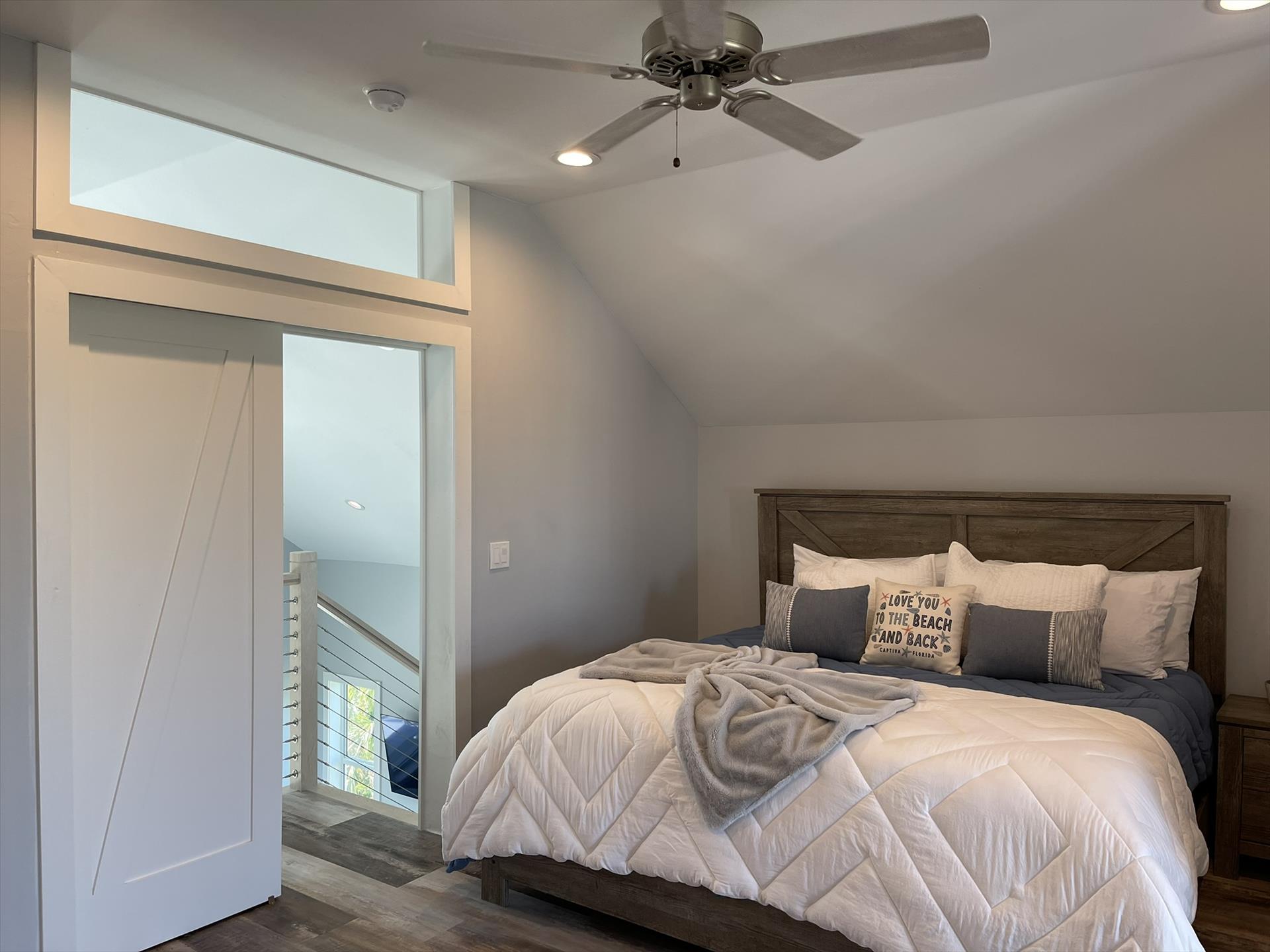 2nd Floor Loft - Huge Main Bedroom with King Bed, Nightstand, TV, Fan, Bureau and Closet. Walk out Back Yard Balcony. En Suite Full Bath with Sink, Toilet, and Tiled Shower.